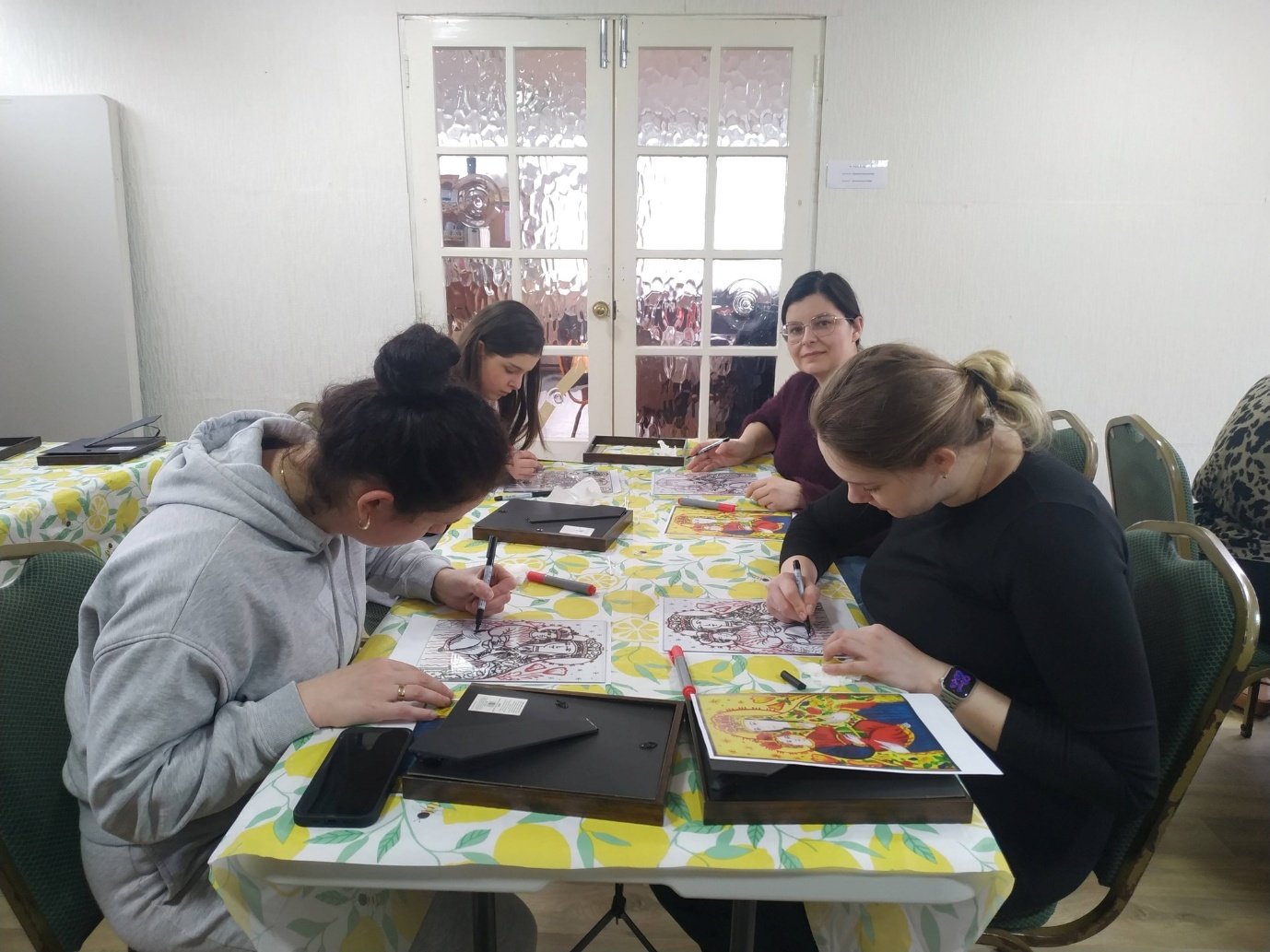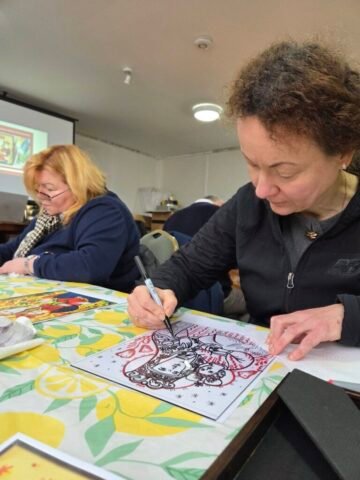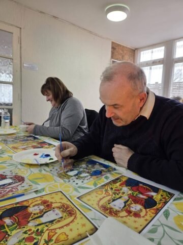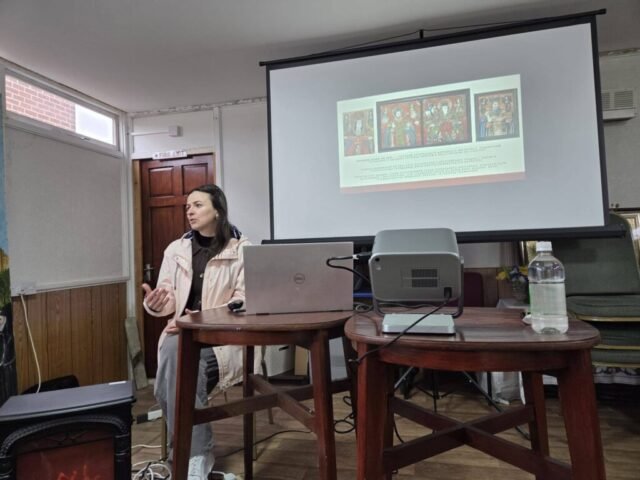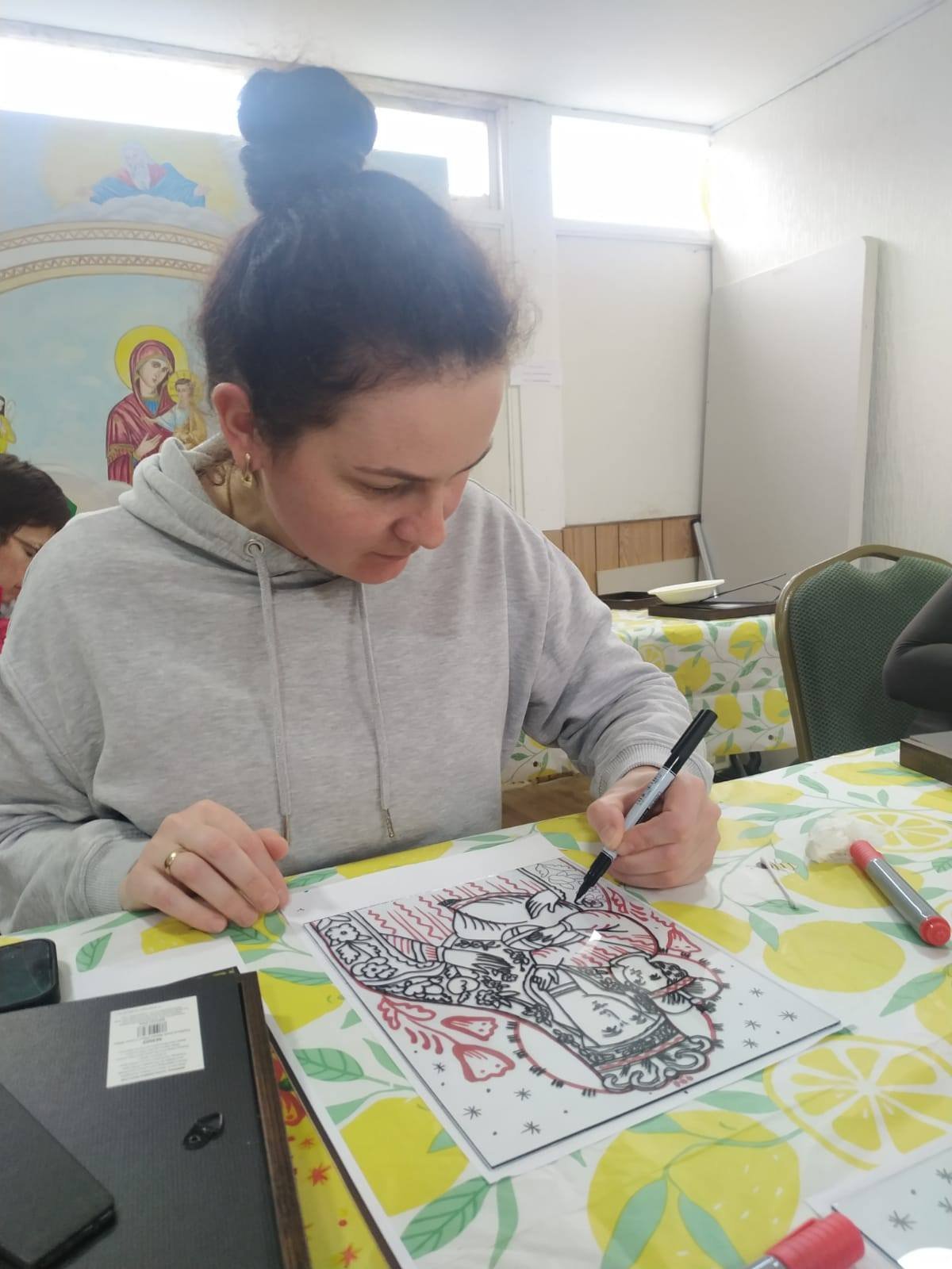 Майстер-клас провела іконописець п. Мар’яна Балтарович із Лестера, яка на початку представила змістовну презентацію про традицію іконопису, його символіку та духовне значення. Завдяки її фаховому і уважному супроводу учасники змогли не лише познайомитися з мистецтвом іконопису на склі, але й самі відчути радість творчого процесу.